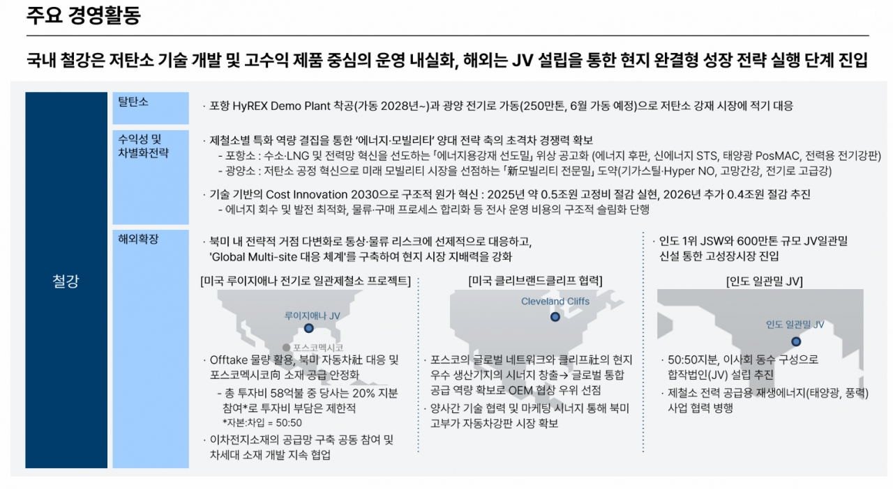 국내 부분은 포항제철소에서는 수소와 LNG 기반의 에너지용강재 선도밀로서 수소 후판, 신에너지용 STS 등을 통해 위상을 공고히 하고 있으며, 광양제철소는 기가스틸과 전기차용 무방향성 전기강판(Hyper NO) 등 미래 모빌리티 시장을 선점하는 전문 제철소로 도약하고 있다. 특히 포항 HyREX 데모 플랜트 착공과 광양 전기로(250만 톤)의 오는 6월 가동을 통해 저탄소 강재 시장에 적기 대응할 계획이다. 또한 전사적인 ‘Cost Innovation 2030’을 통해 작년 0.5조 원에 이어 올해 0.4조 원의 구조적 원가 절감을 추가로 추진한다.