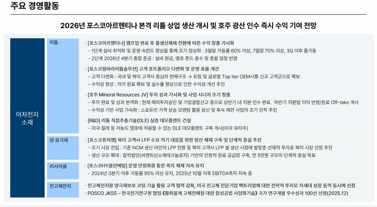 그룹은 2026년을 아르헨티나 리튬 상업 생산 본격 개시와 호주 광산 인수를 통한 수익 창출 가시화의 해로 정하고 이차전지소재 풀밸류체인 가동에 박차를 가할 예정이다. 특히 포스코아르헨티나의 1단계 설비는 3월 가동률 60%를 거쳐 3분기 이후 풀가동 체제로 전환되며, 2단계 설비 또한 올해 4분기 종합 준공을 목표로 순항 중이다.