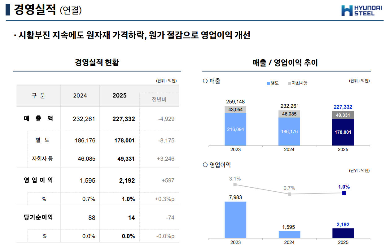 30일, 현대제철이 2025년 실적 컨퍼런스콜(IR)을 개최했다. 현대제철의 경영실적 자료에 따르면 연결기준 매출액은 22조 7,332억 원으로 전년 대비 약 2.1% 소폭 감소했으나, 영업이익은 2,192억 원을 기록하며 전년(1,595억 원) 대비 37.4%나 큰 폭으로 증가했다. 영업이익률 또한 0.7%에서 1.0%로 상승하며 반등의 발판을 마련했다.