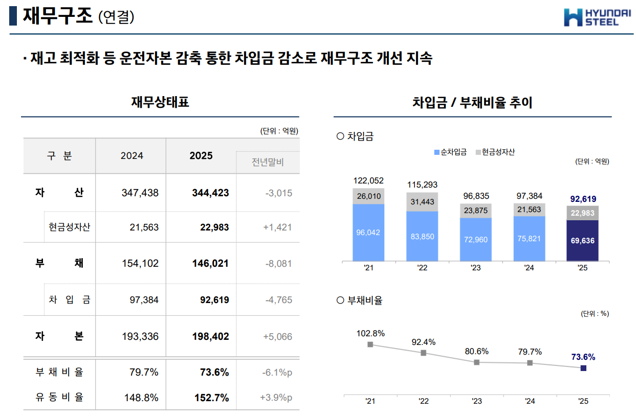 재무구조 또한 한층 탄탄해졌다. 현대제철은 재고 최적화와 운전자본 감축을 통해 차입금을 지속적으로 줄여나가고 있다. 2024년 9조 7,384억 원이었던 차입금 규모는 2025년 9조 2,619억 원으로 약 4,765억 원 줄어들었다. 이에 따라 부채비율은 전년 대비 6.1%p 하락한 73.6%를 기록하며 안정적인 재무 상태를 입증했다. 유동비율 역시 152.7%로 전년 대비 3.9%p 상승해 단기 지급 능력도 강화됐다.