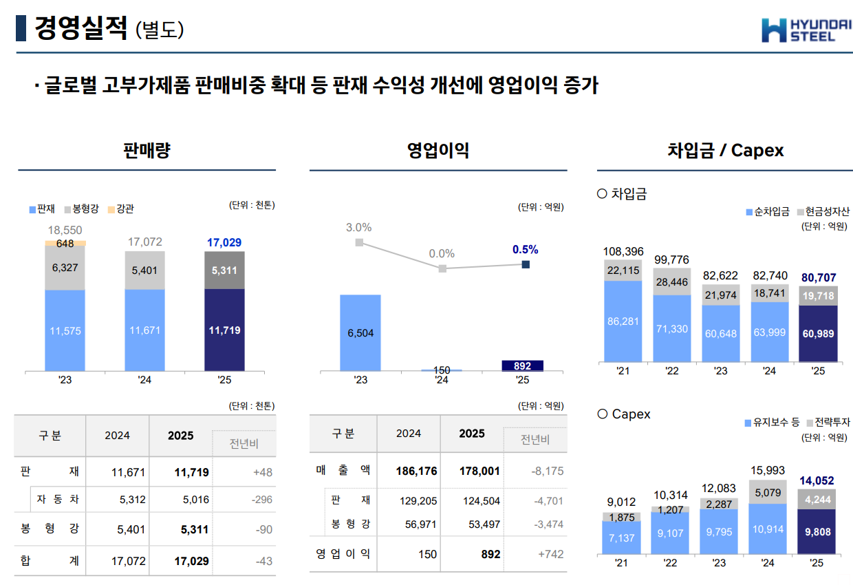 이 같은 수익성 개선의 주요 원인으로는 원자재 가격 하락에 따른 비용 절감과 함께 글로벌 고부가가치 제품 중심의 판매 전략이 꼽힌다. 특히 별도 기준 실적을 살펴보면, 판재류 판매량이 1,171만 9,000톤으로 전년 대비 증가하며 실적을 견인했다. 비록 자동차용 판재 판매는 다소 줄었으나, 전반적인 판재 수익성 개선 노력이 주효하며 별도 영업이익이 전년 150억 원에서 올해 892억 원으로 6배 가까이 급증했다.