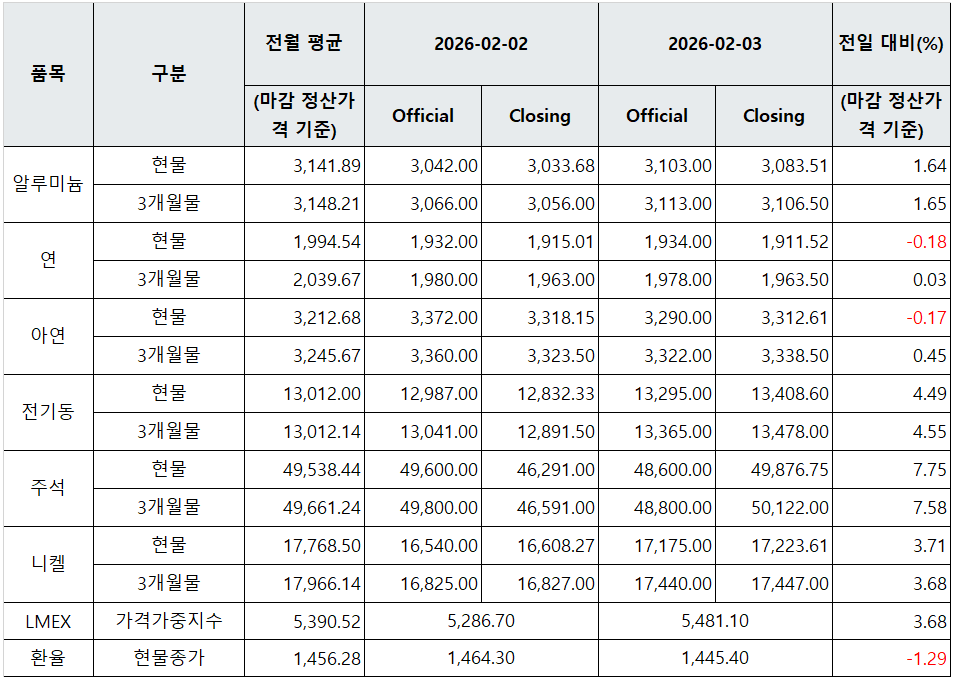 [표] LME 비철금속 및 환율 동향(2월 3일)