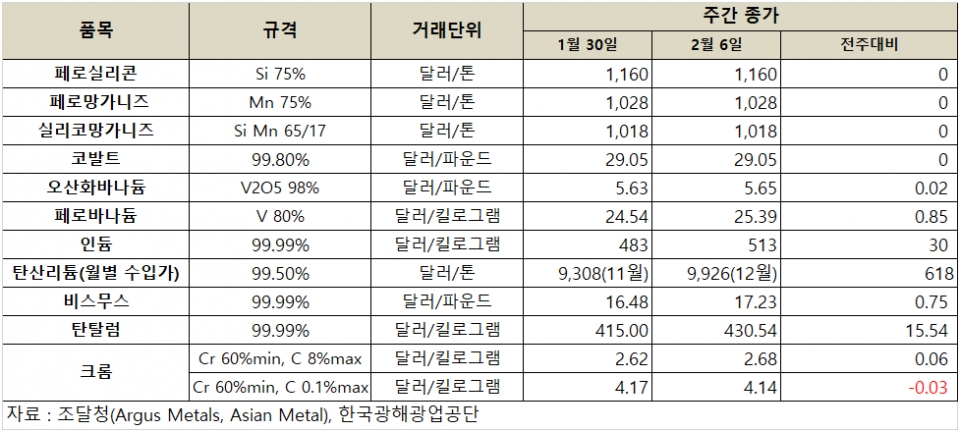 [표] 희유금속 가격 동향(2월 6일)
