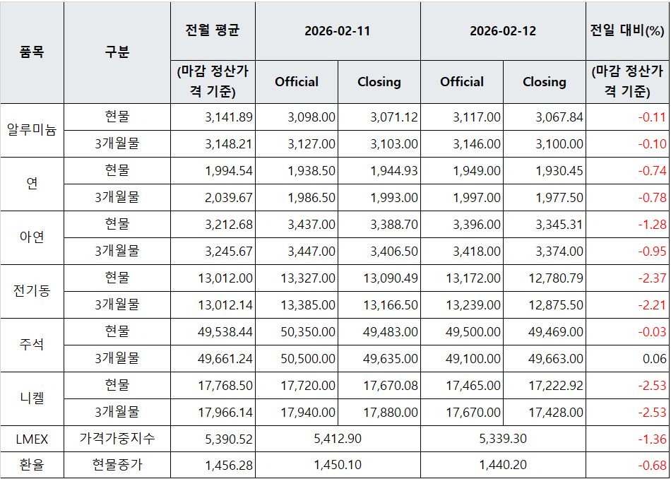 [표] LME 비철금속 및 환율 동향(2월 12일)