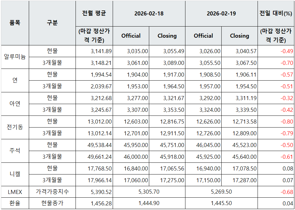 [표] LME 비철금속 및 환율 동향(2월 19일)