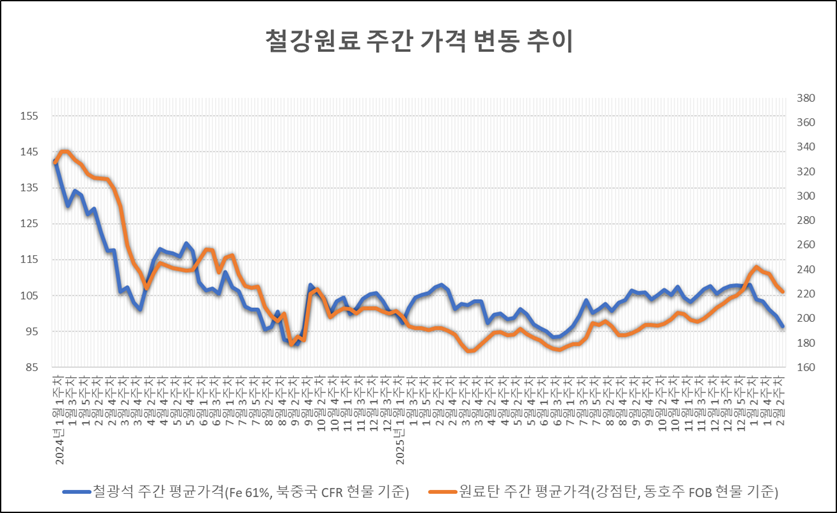 키워드 #철광석 #제철용 원료탄 이사무엘 기자 smlee@snmnews.com 다른 기사 보기 관련기사 [대장간]꺼져가는 전기로와 노사 상생의 중요성 세아이운형문화재단, 2026 세아이운형문화재단 음악회 개최 [연재] 산업현장 안전에 미래 달렸다 – 후진하는 지게차와 벽 사이 끼임 건 "美 관세판결 기계·조선 영향 없어" 대한제강, 3월 26일 주총 개최…이경백 대표 재선임 등 내달 철근 기준價 상승 전망…2년 만에 94만원대 회복 마봉강, 2025년 수요 반등에도 국내 판매 10년來 ‘최저’ 본격 성수기에 해외도 강세…국내 철스크랩 3월 반등 무게? “중국은 안 꺾였다”…10년 전 철강 전망, 어디서 빗나갔나 지난해 美 철강 수입 5개년 내 최소 "SK오션플랜트, 매각 불확실성 해소시 호재 부각" 저작권자 © 철강금속신문 무단전재 및 재배포 금지