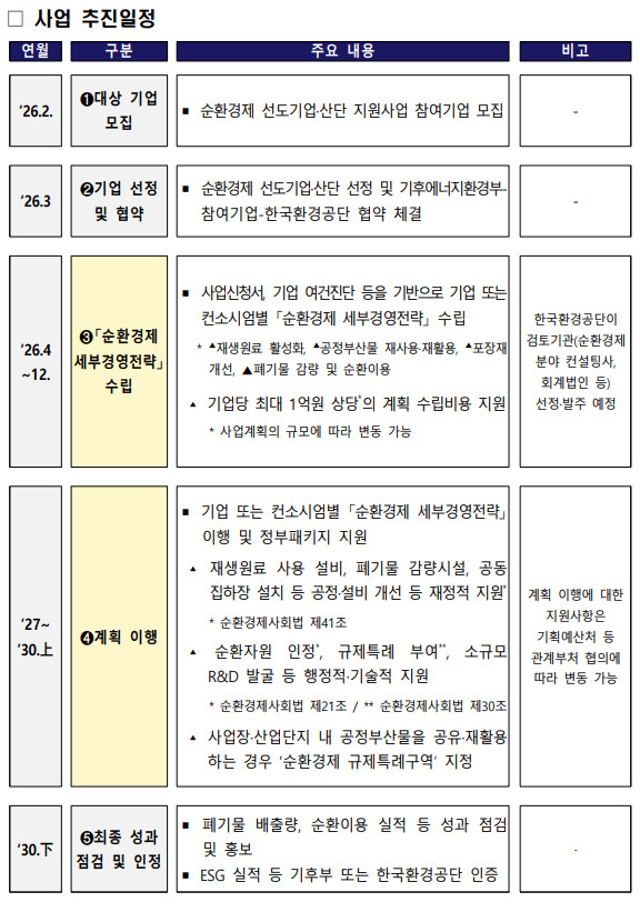 기후에너지환경부는 선정된 기업 또는 협력체(컨소시엄)에 올해 순환경제 세부 경영전략(‘26~’30) 수립 비용을 기업당 약 1억 원을 지원할 계획이다. 아울러 기후부는 수립된 계획을 바탕으로 △폐기물규제 개선 또는 실증특례를 통한 면제, △공정개선 및 설비 설치 지원(중견·중소기업 대상), △공동 기술개발(R&D) 과제 발굴 등 행정적·재정적·기술적 지원을 2030년까지 집중적으로 제공할 방침이다.