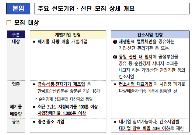 특히 고철과 공정부산물 등 폐기물에 대한 규정은 제한하지 않는다. 다만 개별기업 전형은 최근 3년간 지정폐기물 100톤 이상, 사업장폐기물 1,000톤 이상 '중소 중견 기업'으로 규모가 제한된다. 대기업은 '컨소시엄 전형'으로만 참여가 가능하며 컨소시엄별 대기업 참여 비율 40% 이하로 제한된다.