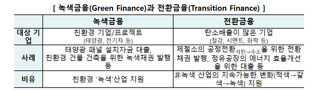 전환금융은 친환경 녹색활동에 대한 지원 중심인 ‘녹색금융(Green Finance)’과 달리, 철강·화학·시멘트 등 고탄소 제조업의 설비 효율화·연료전환과 같은 탄소감축 활동에 대한 지원을 포함한다. 전환금융을 도입한 유럽연합과 일본, 싱가포르 등은 분류체계 도입여부 및 산업구조 등 각국의 경제·산업 여건에 맞는 상이한 기준과 방식으로 전환금융을 운영 중이다.