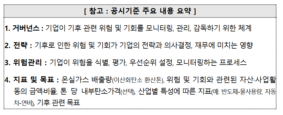 공시시점과 관련해서는 원칙적으로 연말 결산 시점에 공시(통상 3월 말)해야 한다. 다만 배출권 거래제에 따라 기후에너지환경부에서 매년 5월경 배출량을 인증 중인 상황을 고려해, 온실가스 배출량 정보에 한정하여 반기 결산 시점(8월 중순)에 공시하는 것이 허용될 예정이다.