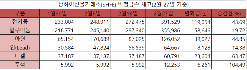 김영은 기자 yekim@snmnews.com 다른 기사 보기 관련기사 [표] 상하이선물거래소 재고(2월 13일) [표] 상하이선물거래소 재고(2월 6일) [표] 상하이선물거래소 재고(3월 6일) [표] 상하이선물거래소 재고(3월 13일) 저작권자 © 철강금속신문 무단전재 및 재배포 금지