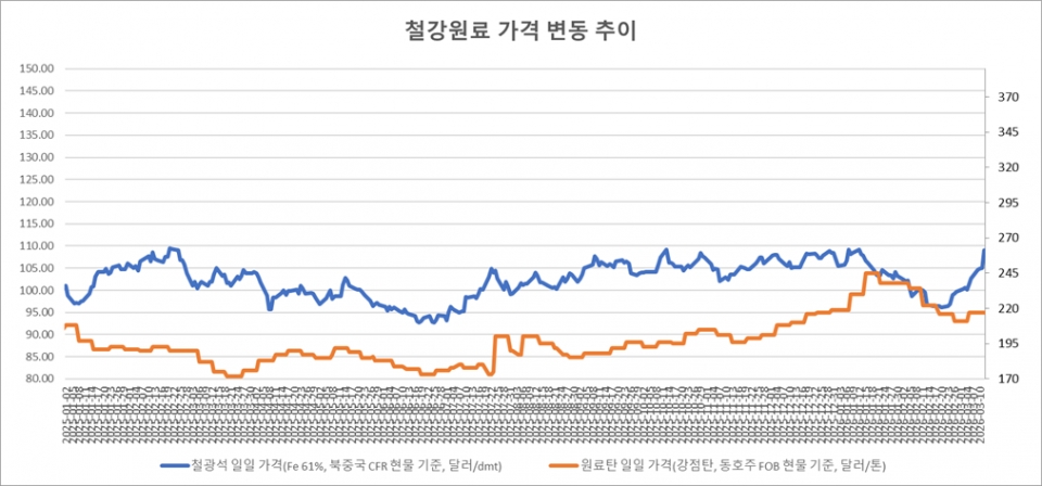키워드 #철광석 #제철용 원료탄 이사무엘 기자 smlee@snmnews.com 다른 기사 보기 관련기사 세아제강-경북적십자사, 포항서 무료급식 봉사 실시 (주간시장동향 – 특수강봉강) 공급망 붕괴·제품價 약세 ‘장기화’ (주간시장동향 – 선재) 수입 감소에도 수요 부진·제품價 약세 ‘지속’ 포스코, 전기로 2026년 가동…하이렉스·AI 제철소 전환 속도 포스코청암재단, 한국유학장학생 19명 선발…장학사업 글로벌 확대 강관협의회, '소재사-강관사 상생기술 교육' 개최 기계硏, 일상 작업 수행하는 ‘로봇 작업 AI’ 개발 관세청장, 포항제철소 찾아 철강 덤핑 대응 점검 [주간시장동향-후판] 제조사 인상 영향…유통시장 상승 흐름 한국 경제의 ‘반도체 착시’…전방산업 침체·대미 관세에 철강 수요 회복 더뎌 저작권자 © 철강금속신문 무단전재 및 재배포 금지
