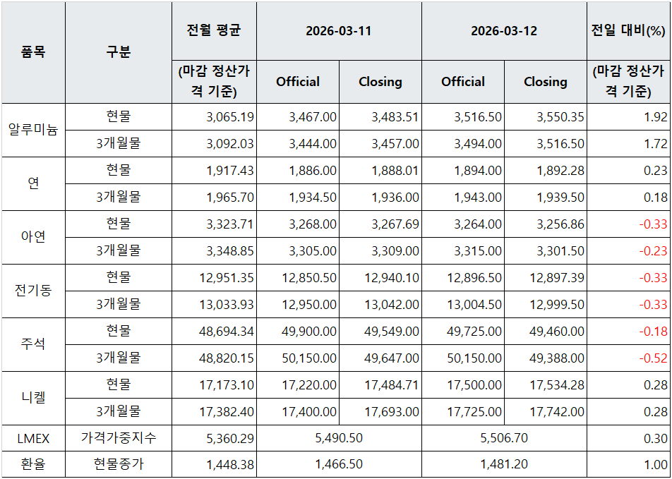 관련기사 [표] LME 비철금속 및 환율 동향(3월 11일) [표] LME 비철금속 및 환율 동향(3월 10일) [일일비철시황] 달러 약세 영향 LME 비철 상승…구리·니켈 공급 우려 부각
