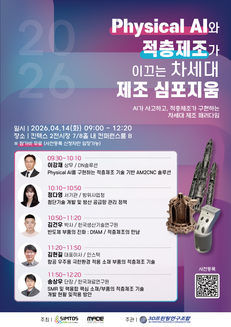 행사는 심토스 2026가 주최하고, 3D프린팅연구조합이 주관한다. 적층제조 기술의 산업 적용 범위를 반도체, 방위산업, 항공우주, SMR(소형 모듈식 원자로)과 핵융합 등으로 넓혀가고 있는 흐름 속에서, 실제 수요 산업이 요구하는 기술 수준과 정책 과제를 함께 논의하는 자리가 될 전망이다.