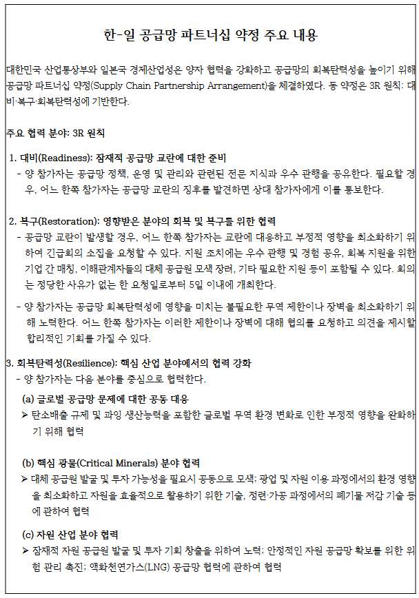 아울러 회담에 앞서 양측은 공급망 위기 대응 및 산업 협력을 위해 「한-일 공급망 파트너십(SCPA)」을 체결하였다. SCPA는 상호 공급망에 부정적 영향을 주는 정부 조치를 자제할 것과 발동 시 협의할 것, 교란 징후 발견 시 통보하고, 교란 발생 시 5일 내 긴급회의를 열 것 등의 내용을 담고 있다. 이 같은 내용은 양국 간 철강 무역과 제3국과의 철강 이슈 등에서도 영향을 미칠 것으로 보인다.