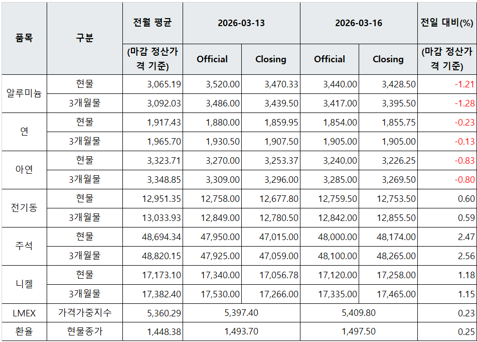 관련기사 [일일비철시황] 달러 강세 속 혼조…중동 리스크에 알루미늄 긴장 지속 [표] LME 비철금속 및 환율 동향(3월 13일) LME, 전자거래 3시간 멈춰…‘시장 교란’ 선언 [표] LME 비철금속 및 환율 동향(3월 17일) [표] LME 비철금속 및 환율 동향(3월 18일)