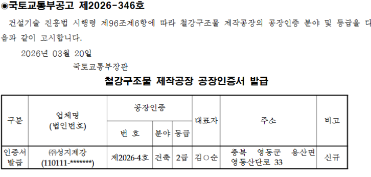 국토교통부는 20일, 성지제강 영동 강구조물공장(영동제10공장/충북 영동군 용산면 영동산단로33)에 철강구조물 제작공장 건축2급 인증서를 신규 발급했다고 공고했다.