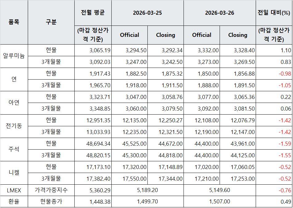 [표] LME 비철금속 및 환율 동향(3월 26일)