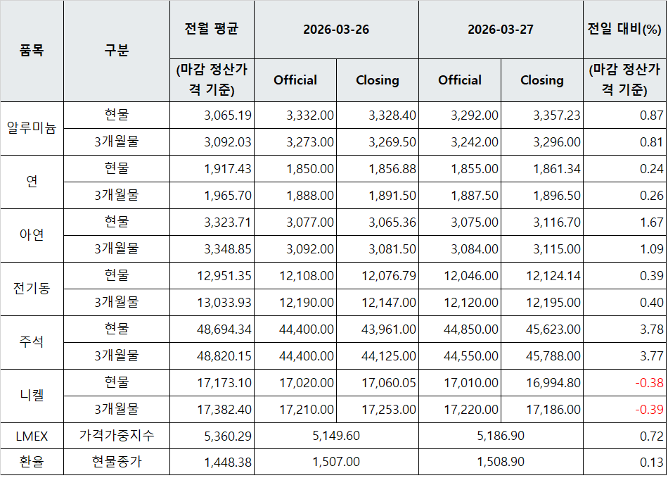 [표] LME 비철금속 및 환율 동향(3월 27일)