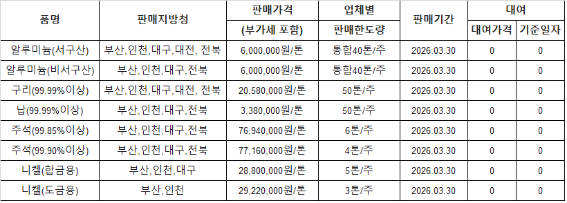 김영은 기자 yekim@snmnews.com 다른 기사 보기 관련기사 [표] 조달청 방출 가격(3월 27일) [표] 조달청 방출 가격(3월 26일) [표] 조달청 방출 가격(3월 31일) 저작권자 © 철강금속신문 무단전재 및 재배포 금지
