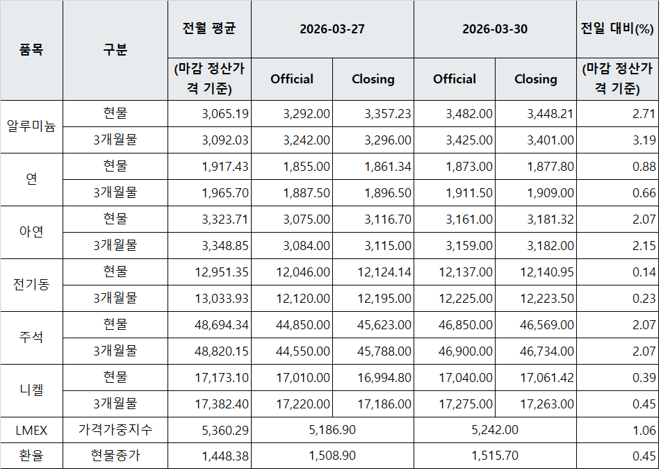 김영은 기자 yekim@snmnews.com 다른 기사 보기 관련기사 [표] LME 비철금속 및 환율 동향(3월 27일) [표] LME 비철금속 및 환율 동향(3월 26일) 저작권자 © 철강금속신문 무단전재 및 재배포 금지