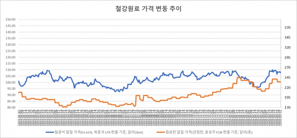 키워드 #철광석 #제철용 원료탄 이사무엘 기자 smlee@snmnews.com 다른 기사 보기 관련기사 日 공영제강, 4월 철근 판매價 1만엔 인상…두 달 연속↑ 철강 저탄소 전환 제도 본격화…산업통상부, 인증·수요·인프라 틀 마련 KG스틸, 중고차 플랫폼 케이카 인수…철강 넘어 ‘유통 플랫폼’ 승부수 성원, STS강관업 ‘감산’ 뚫고 나홀로 증산…영업익 28.7% 급증 기후부·산업부, 철강업 탄소중립 기술 확보 등 철강·금속 연관 추경안 요청 [오늘 중국은-표] 중국 철강업 PMI, 8개월 만에 50↑ [이슈] 중동 변수에 아연·도료 등 ‘표면처리 비용’ 들썩…컬러·도금강판 비용 오르나 ‘반덤핑 조치론 부족’ EU, 방향성 전기강판 세이프가드 조사 [일일비철시황] 전쟁 리스크 완화 기대…비철價 ‘강세 마감 현대제철, 당진 청소년 대상 안전교육 고도화…딥페이크 예방 프로그램 도입 수출 800억달러 돌파 속 철강만 ‘역행’…3월 수출 감소 철강업계, 에너지 절감 대응 확대…전사적 실천 강화 저작권자 © 철강금속신문 무단전재 및 재배포 금지