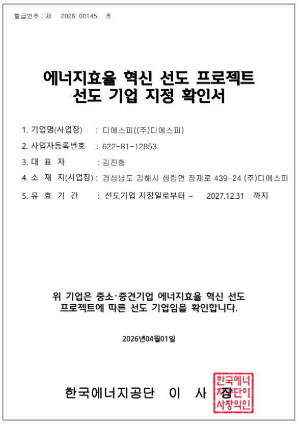 특히 단순히 전력 사용량을 줄이는 것을 목표로 하지 않고, 기업의 생산 및 운영 구조를 저소비·고효율 구조로 근본적으로 체질 개선하는 것을 최종 목적으로 운영되고 있다. DSP는 이번 선도기업으로 선정에 대해 에너지 효율 개선의 여지가 크고, 이를 실행할 혁신 역량을 충분히 갖추고 있음을 대외적으로 공인받은 것이라고 설명했다.