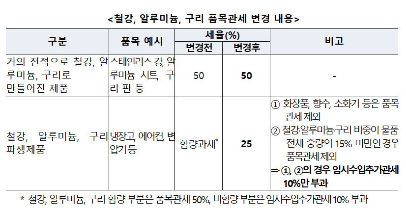 이에 따르면 첫째, 철강·알루미늄·구리 제품 및 파생제품의 전체 가격에 대해 25% 또는 50% 품목관세가 부과된다. 기존에는 철강, 알루미늄, 구리의 함량 가치과 비함량 가치를 구분하여 함량 부분에는 품목관세 50%, 비함량 부분에는 임시수입추가관세 10%를 각각 부과하던 방식이 바뀌었다.