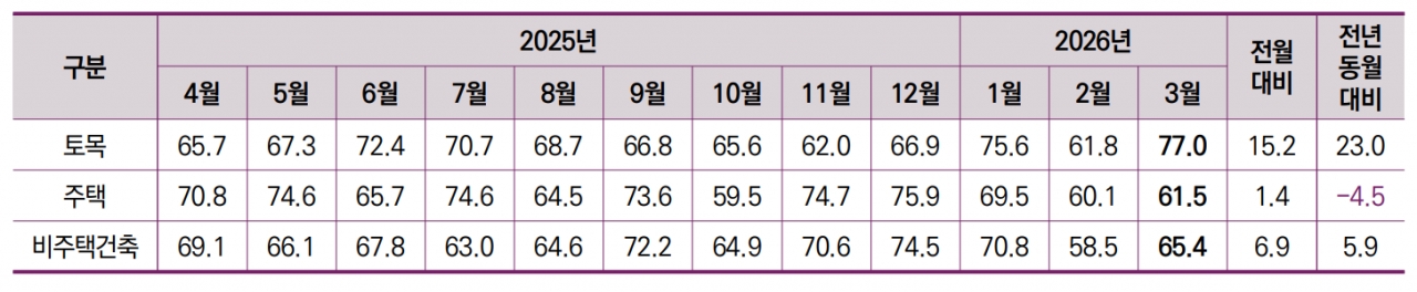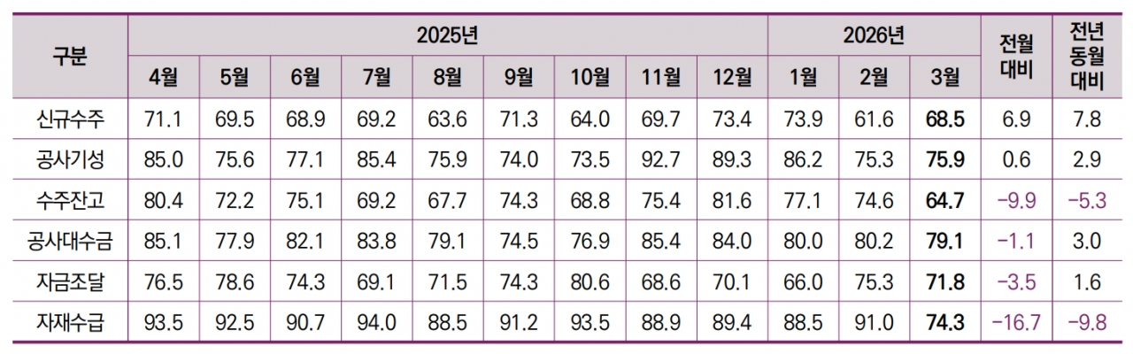 중동 사태에 따른 원자재 시장 불안 등 공급 여건 악화가 반영된 결과라고 이 연구원은 진단했다. 수주잔고지수(64.7) 역시 9.9p 하락하며 향후 공사 여력의 약화를 시사했다.