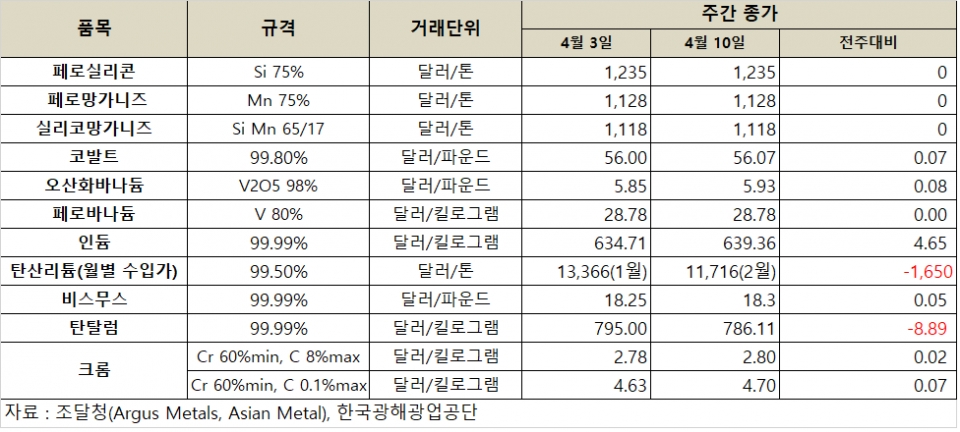 관련기사 [표] 희유금속 가격 동향(4월 3일) [표] 희유금속 가격 동향(3월 27일) 수요 둔화·공급 압박·정책 변수…中 공급망 재편 속 희유금속 변동성 확대 [표] 희유금속 가격 동향(4월 17일)