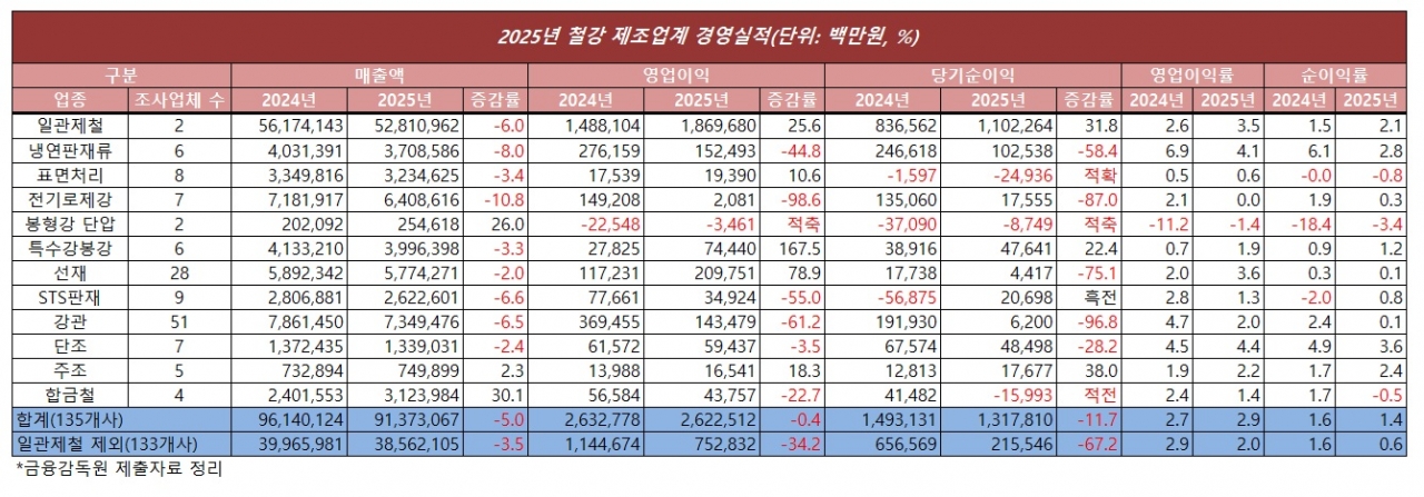 본지 조사, 철강 제조 135개사 2025년 경영실적