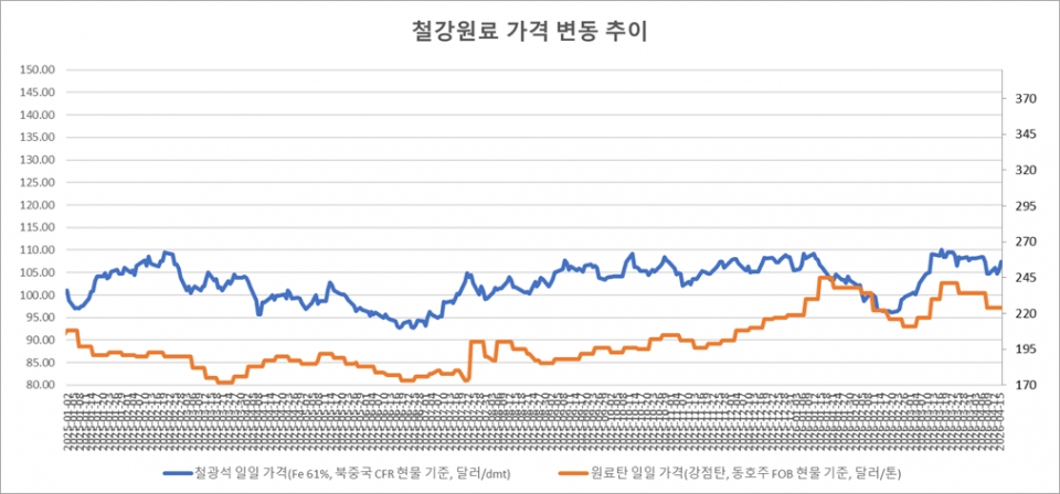 키워드 #철광석 #제철용 원료탄 이사무엘 기자 smlee@snmnews.com 다른 기사 보기 관련기사 지난해 봉형강 유통업계도 적자전환…출혈경쟁 불가피 (주간시장동향-강관) 4월 2차 가격 인상 나서나 현대제철, 현대비앤지스틸 지분 유지 중…지분 추가 매각설은 ‘뜬소문’? (주간시장동향 – 선재) 수요 둔화·수입 증가에 ‘시황 악화’ 대외 악재에 경강선재 판매 부진 ‘장기화’ (주간시장동향 – 특수강봉강) 원가 상승·수입 감소에 제품價 ‘상승’ 구조관, 中 아연도강판에 반덤핑관세 부과 소식에 '당혹' [공시] 현대제철 1분기 기업설명회 4월 24일 개최 [주간시장동향-열연강판] 유통價 강세 지속…공급 제약에 시장 긴장 [주간시장동향-후판] 후판 유통價 상승 흐름…재고 부담 속 추가 상승 눈길 포스코미술관 광양 1주년…‘상상으로 엮인 지도’로 지역과 만나다 [주간시장동향-국제] ‘바오산·안산 선별적 인상’ 철강價 주 후반 소폭↑ 포스코, 가공센터 운영 기준 유지…신중한 선별 기조 이어가 지난해 유통업계 실적 희비…열연강판 선방·STS 적자 저작권자 © 철강금속신문 무단전재 및 재배포 금지