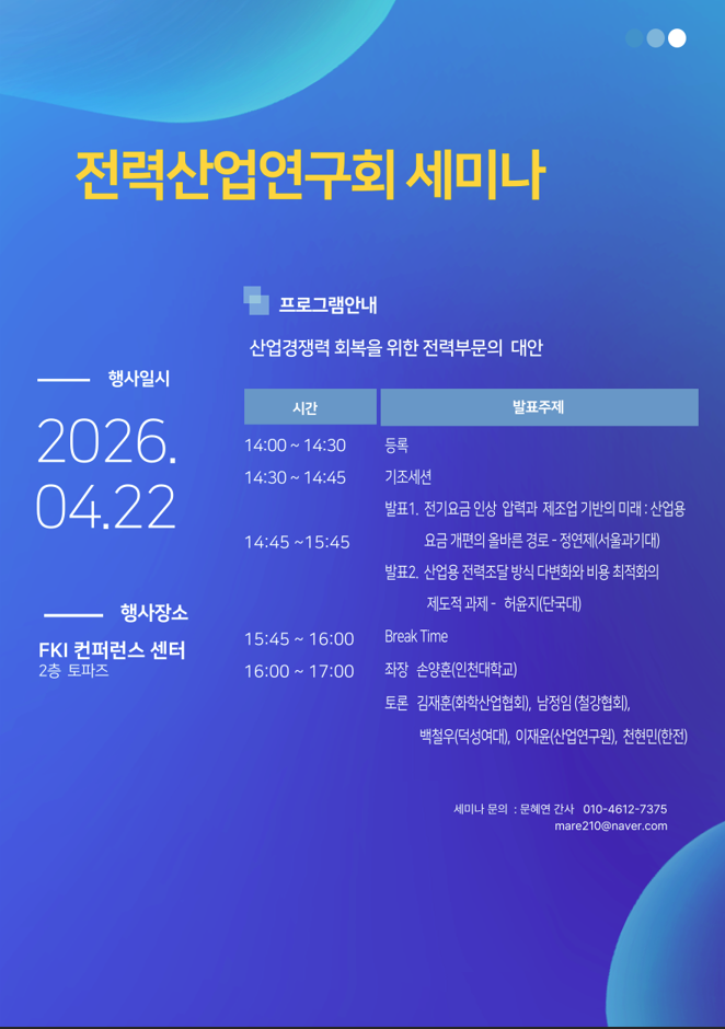 전력산업연구회가 지난 22일, FKI 컨퍼런스센터에서 ‘산업경쟁력 회복을 위한 전력부문의 대안’을 주제로 정책 세미나를 개최했다. 이번 세미나에는 한국철강협회, 산언연구원, 화학산업협회, 한국전력 등이 참여해 급격한 전기요금 인상에 따른 제조업 기반의 붕괴 우려와 이를 해결하기 위한 제도적 과제 등을 심도 있게 논의했다.