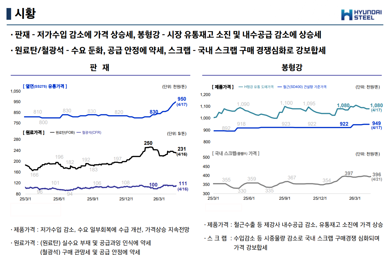 현대제철이 공개한 시황 분석에 따르면 판재 부문은 저가 수입재의 유입이 감소하고 수요가 일부 회복되면서 수급 불균형이 해소되는 양상이다. 이에 따라 열연(SS275) 유통 가격은 3월 83만 원 선에서 4월 17일 기준 톤당 95만 원까지 가파르게 올랐다. 반면 원료탄(231달러)과 철광석(111달러) 등 핵심 원재료 가격은 공급 안정화로 인해 약세를 보이고 있어, 제품 가격 상승에 따른 마진 확대가 기대된다.