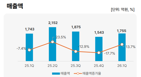 1분기 매출액 1,755억원 전분기比 13.7%↑