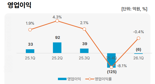 올 1분기 6억원의 영업손실을 기록하며 전년 동기(+33억원) 대비 적자 전환됐으나, 전분기(-125억원)와 비교하면 적자폭은 크게 줄인 모습이다.
